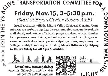 In collaboration with the Miami Valley Regional Planning Commission, we are bringing together community members to evaluate walkability in downtown Yellow Springs and discuss opportunities to improve walking, biking and rolling infrastructure. This guided exercise needs diverse experiences/perspectives, improving the Village’s ability to secure grant funding. Make a Difference by Helping to Ensure Safety for All Ages & Abilities.