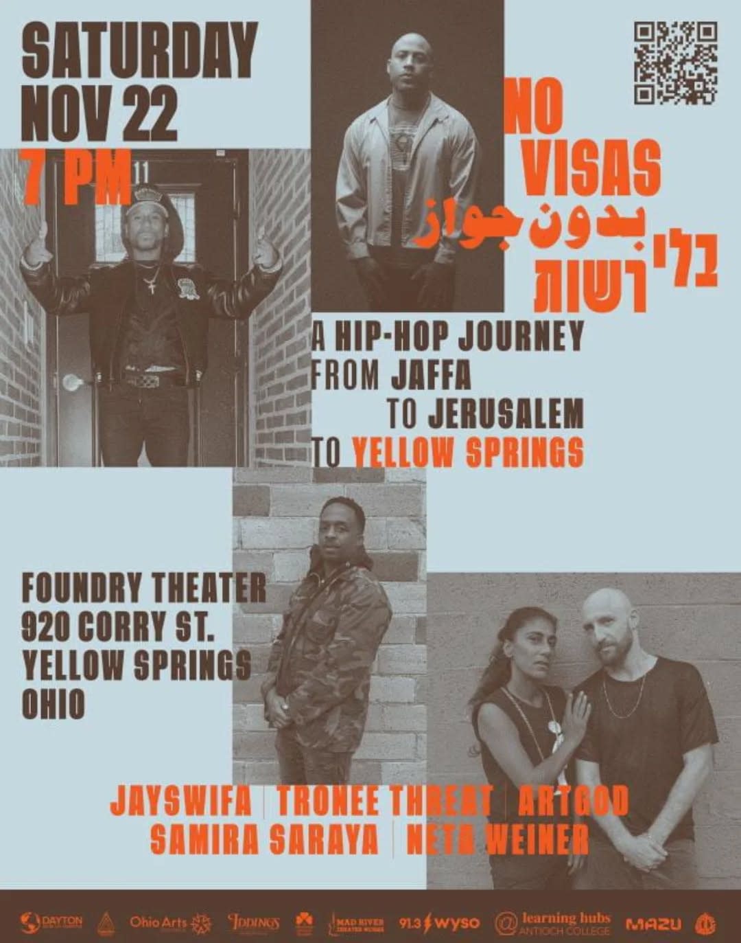 NO VISAS brings together five renowned hip-hop artists to perform both individually and collectively, the culminating performance after a multi-month collaborative artistic process. The Foundry Theater welcomes, for the first time, Neta Weiner and Samira Saraya of Beit System Ali, a cultural educational movement based in Holon, whose activity is based on the belief in the power of artistic action to promote equality and generate socio-political change. After a year of preparation, Neta and Samira’s in-person tour in Ohio was cancelled in August 2025 due to no visas being issued for them by the current administration. This project hence pivoted to a remote collaboration with three Ohio hip-hop artists based in Yellow Springs: Jayswifa, Tronee Threat, and ArtGod. Through countless remote meetings, sharing inspiration and beats, and discussing what it means to make art in times of political unrest and turmoil, these five artists have pushed themselves to create music together that speaks to the realities of life in America, Palestine, and Israel.